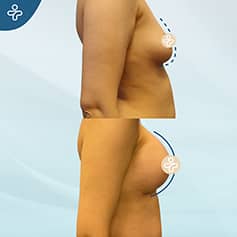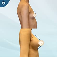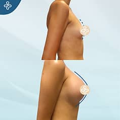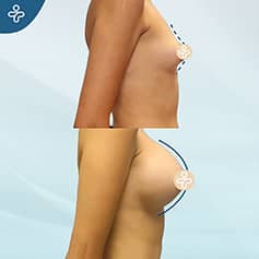 Here is a clear example of the big different that breast augmentation can bring about in a single surgery. Our patient wanted high+ projection implants in a single operation, without dilatation. There is no visible scar in this example, as the implant placement was performed with an intraaxillary incision, concealed below the armpit.