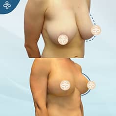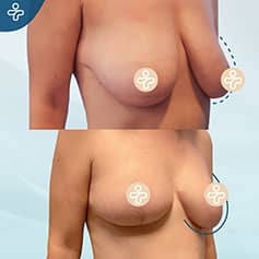 In our first example, we see a moderate case of sagginess being solved through a standard vertical incision, stretching from the aureola down until the breast fold. The incision naturally fades over time and becomes less visible, while this type of procedure allows for a safe, effective operation with long-lasting results.