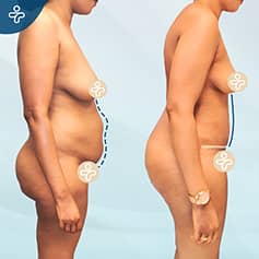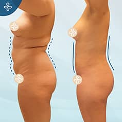 Here is an example of a combined lipo + tummy tuck surgery. The before and after results include upper back fat reduction and abdominal skin tightening to achieve a flat tummy and a lean, flat sideline. You will notice an almost imperceptible scar along the natural fold lines of the lower abdomen.