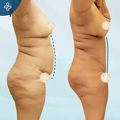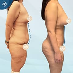 This example illustrates how an extended procedure can help tight skin on the lower and upper back, along the hipline, on top of achieving abdominal flatness. Our patient came to us with a protuberant, double-humped belly and achieved a flat tummy with likewise slip hips.